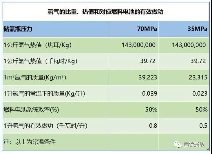 表2:氢气的比重、热值和对应燃料电池的有效做功