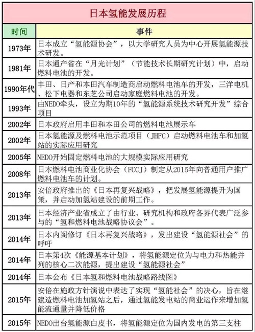 2013年,安倍政府推出的《日本再复兴战略》,把发展氢能源提升为国策,并启动加氢站建设的前期工作。在第4次《能源基本计划》中,日本政府将氢能源定位为与电力和热能并列的核心二次能源,并提出建设“氢能社会”的愿景。