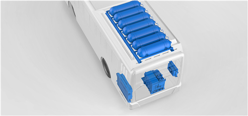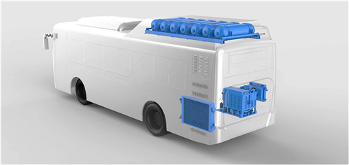 H2Motiv L是一种燃料电池集成系统,包括燃料电池堆、冷却管路、空气管路、氢气管路和FCCU(催裂化装置)和DC/DC(见图38),可添加到基于电池的城市货车,服务卡车和公共汽车中。在汽车中,H2Motiv L与加湿器、压缩机以及散热器配合使用(见图39),从而为车辆提供电力。