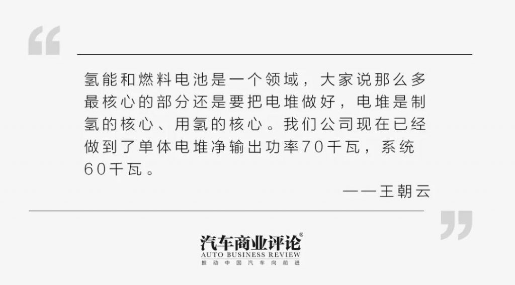 王朝云:氢能和燃料电池是一个领域,大家说那么多,最核心的部分还是要把电堆做好,电堆是这里面制氢的核心、用氢的核心。我们公司现在已经做到了单体电堆净输出功率70千瓦,系统60千瓦,大家可以到我们公司去看看,少说多做。