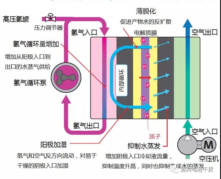 如下图所示,Mirai燃料电池堆的自增湿性能主要通过以下四个方面实现:1.薄膜化促进电化学产物水反扩散;2.氢气循环系统(氢气循环泵)中增加了阳极入口到出口的水蒸气含量;3.空气和氢气的逆流形式;4.增加阴极入口冷却液流量,抑制温度升高,增加阴极入口侧气体相对湿度。