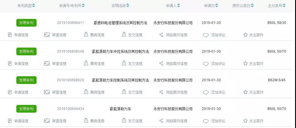 氢云链在“中国及多国专利审查信息查询”网站上检索,确实发现永安行申请了四项燃料电池相关发明专利,日期集中在2019年1月30日。