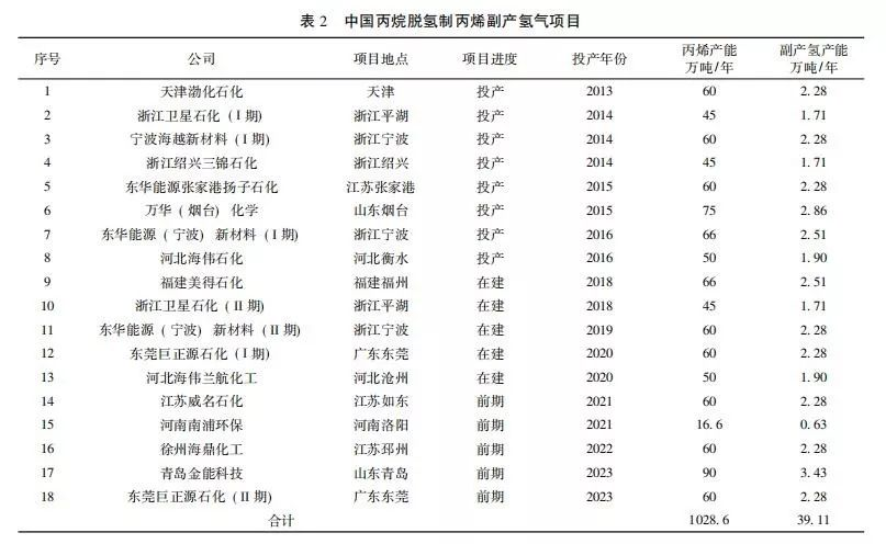 从氢能发展的初期来看,应充分利用工业副产氢气,其次可以适当发展煤气化制氢,少发展石油天然气裂解制氢,限制发展电解水制氢。自2010年以来,由美国引领的页岩气革命,使美国天然气产量呈现爆发性增长,生产天 然气的同时副产大量的凝析油,经过分离,副产 大量乙烷、丙烷,而全球乙烯、丙烯需求增长迅 速,使乙烷脱氢制乙烯生产聚乙烯技术得以迅速 发展,并副产大量氢气。近年来国际液化石油气市场供应充足,丙烷市场供应稳定,丙烷脱氢制 丙烯副产大量氢气。每生产一吨乙烯/丙烯副产 0. 057 ~ 0. 062 /0. 038~0. 042 吨氢气,目前全国丙烷脱氢副产氢气约18. 50万吨/年,预计到 2023 年达到39. 11 万吨/年。这些副产的氢气都可以成为稳定的氢能供应。中国丙烷脱氢制丙烯副产氢气项目见表 2