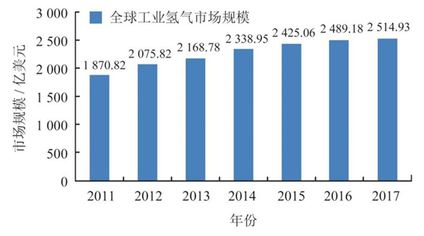 全球氢工业发展迅猛,市场规模从2011年的1870.82亿美元增长到2017年的2514.93亿美元,