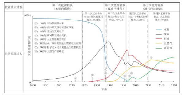 人类社会已经历了三次工业革命(图 2),从 20 世纪中叶起,伴随着第四次工业革命全球向新能源转型已经开始(图 3)。纵观能源发展史,三大能源升级换代体现了“三大经济”形态。瓦特发明蒸汽机促使木柴向煤炭的第一次重大转换,表现为“高碳经济”;戴姆勒发明内燃机,完成煤炭向油气的第二次 重大转换,呈现出“低碳经济”;现代科技进步与当 今环保要求推动传统化石能源向氢能等非化石新能 源的第三次重大转换,全球可能逐步迈入非碳的“氢能时代”。