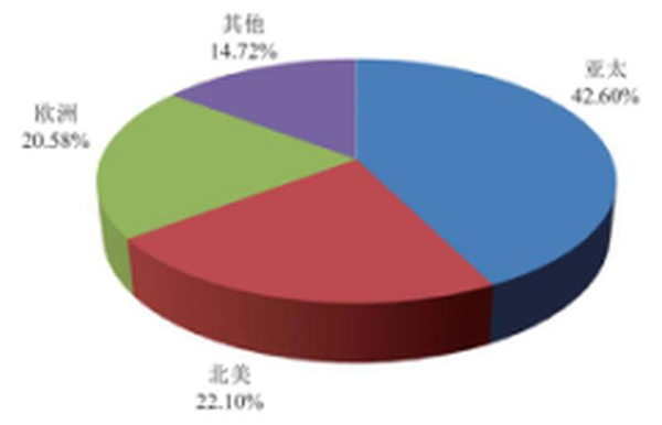 亚太地区工业氢气生产量居全球首位,北美地区紧随其后(图 4)。2017 年亚太地区工业氢气的生 产规模为1 071.36 亿美元,北美为555.80亿美元,而欧洲则为 517.57 亿美元。中国和印度等亚太发展中国家经济快速增长,由此带来了亚太地区对氢能等清洁能源的强劲需求。