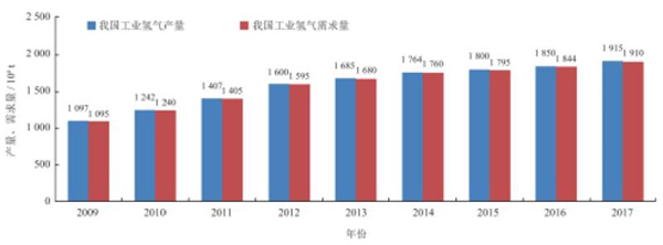 中国工业氢气的需求量和生产量旺盛,呈逐年上升的态势,目前保持着供需平衡的状态,需求量和产量均居世界首位。作为全球氢能利用的大国,中国自 2009 年产量首次突破 1 000×104 t 以来,已经连续 9 年保持世界第一(图 5)。