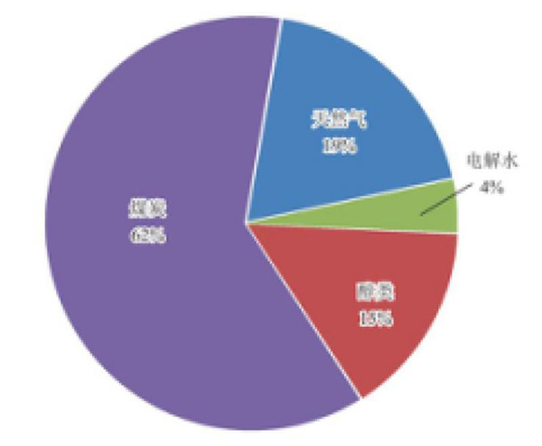 2017 年,全球主要人工制氢原料的 96% 以上都来源于传统化石资源的热化学重整,仅有 4% 左右来源于电解水(图 6)。煤炭和天然气是我国人工制氢的主要原料,占比分别为 62%和 19%(图 7)。电解 水制氢在日本氢工业中占有特殊的地位,其盐水电解制氢的产能占该国所有人工制氢总产能的 63%。
