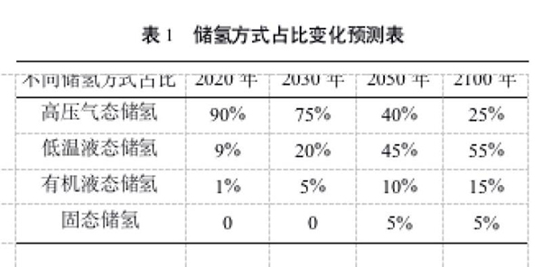 目前工业氢气主要采用高压气态的方式储存,由于成本的限制,液态储存的方式使用较少,主要用于航空航天领域。但随着技术的不断成熟,预计 2050年液态储氢将成为工业氢气的主要储存形式 (表 1)。