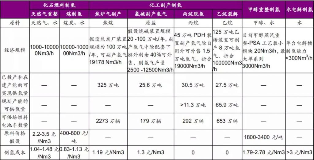 (1)从出厂成本来看,焦炉气、氯碱、丙烷脱氢制丙烯和乙烷裂解制烯烃副产的粗氢气可以经过脱硫、变压吸附和深冷分离等精制工序后作为燃料电池车用氢源,成本远低于化工燃料制氢、甲醇重整制氢和水电解制氢等路线。