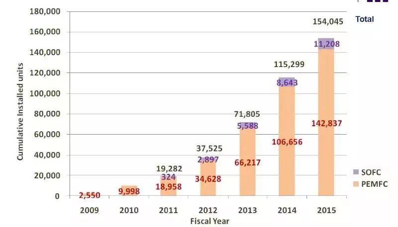 分布式燃料电池系统目前分为重整制氢式燃料电池系统(多以天然气为原料)以及纯氢燃料电池系统。近年来,前者在欧洲、美国及日本发展迅猛,尤以日本的普及率最高。截至 2016 年底日本已经累计推广 20 万台 ,2016 年底的售价为 127 万日元(约为 7.5 万元人民币),补贴降低到 15 万日元(约为 8800 元)。政府的目标是到 2030 年累计推广 530 万台。