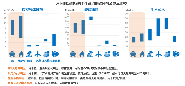 对比不同路线的全生命周期碳排放及成本,天然气制氢成本比煤制氢要高,煤制氢成本比较低,适合规模化的生产,可配备ccs实现碳中和,由灰氢变成蓝氢。