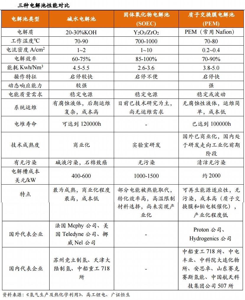 碱性水解技术最为成熟但效率低,高效率的PEM与SOEC技术待推广。
