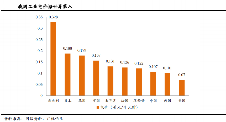 与其他国家相比,我国工业电价位于中低水平。