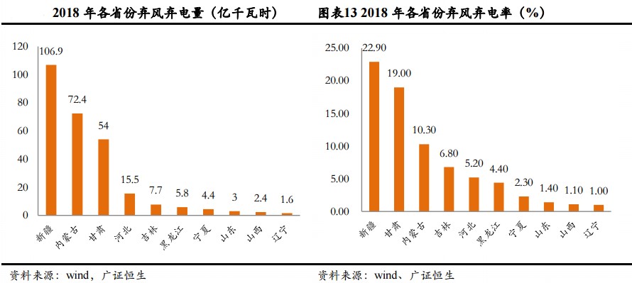 2018年弃风弃电率排名前三的省份分别为新疆、内蒙古和甘肃,全国平均弃风弃电率为7%,这三个省份均超过了10%。由于可再生资源丰富,西北省份也是电价最低的地区。