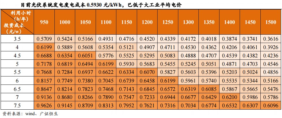 全国大工业电价的均价为0.61元/kWh。以光伏系统投资成本5元/W,全国平均年有效利用小时1150小时计算,目前光伏系统发电成本0.5930元/kWh,已经低于大工业电价。