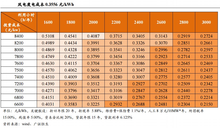 2018年全国风电平均利用小时数2095小时,考虑到7%的弃风率,实际平均利用小时数1948小时,以7500元/kW投资成本测算,目前全国风电度电成本约为0.3656元/kWh,低于光伏发电度电成本。