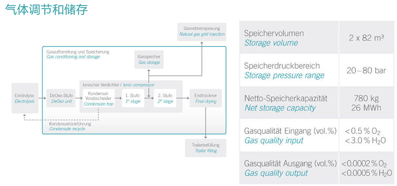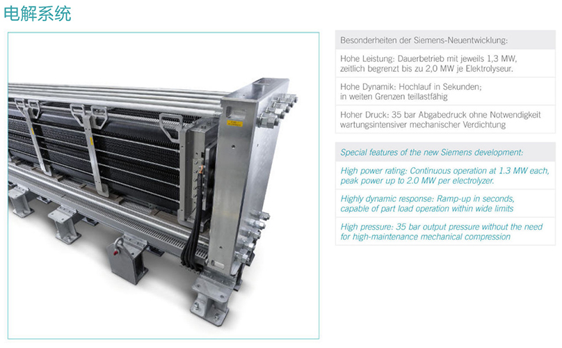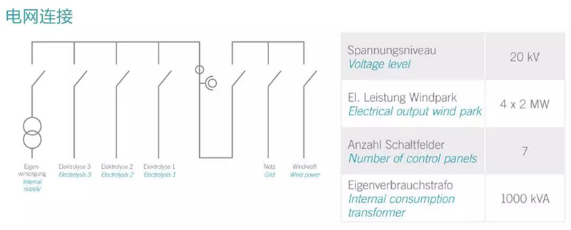 三大核心技术是PEM电解制氢、变压系统控制以及氢气净化压缩。西门子为该项目配备了3台Silyzer200电解槽(额定功率3.75MW,峰值功率可达6MW)和基于Simatic控制装置的电解系统,充分利用PEM快速响应和宽功率区间的优势来应对风电的波动性。此外,西门子还提供配备GEAFOL变压器的中压站,为Sinamic转换器的低压和高压电源装置及气体绝缘中压配电盘(20kV)供电。林德集团负责关键的氢气净化、压缩、存储及分装部分。林德集团独创的创新离子压缩技术可以保证氢气的压缩过程高效节能,并拥有极高的操作灵活性。莱茵应用技术大学提供科学监督服务,分析项目所有组件的协同,譬如,电解槽与压缩机之间的相互作用,或者并入电网和燃气管网。