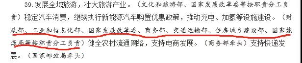 而根据中国政府网披露,3月29日,《国务院关于落实〈政府工作报告〉重点工作部门分工的意见》中,关于“稳定汽车消费,继续执行新能源汽车购置优惠政策,推动充电、加氢等设施建设”部分,明确由“财政部、工业和信息化部、国家发展改革委、商务部、交通运输部、住房城乡建设部、国家能源局等按职责分工负责该项工作”。