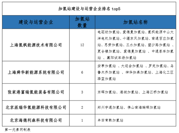 第一元素网根据加氢站建设运营企业参与建设运营的加氢站(已投入运营)个数进行了排名,其中氢枫能源排名第一,参加12所加氢站建设与运营工作。据了解氢枫能源也积极与气体公司以及加氢站设备企业合资合作,共同参与加氢站建设和运营。