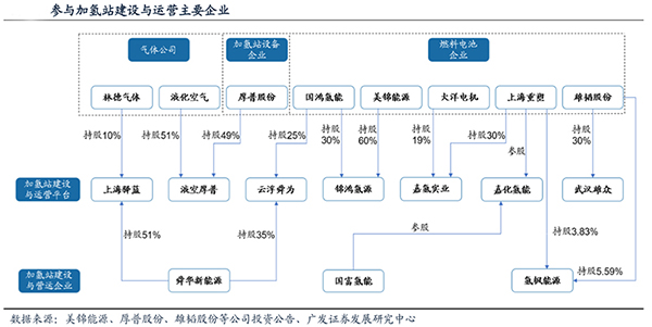 在统计已投入运营的52所加氢站中,共有40多家企业参与加氢站建设,按照这些公司在氢燃料电池产业链所处位置不同可以划分为三大类: