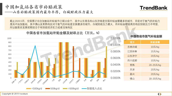 不过在国家补贴标准出台之前国内已有众多省市已经推出了相关加氢站地补补贴标准。以下是TrendBank势银整理的关于加氢站补贴标准,从中可以不难看出早在国补出台出台之前大多数地方省市已经将加氢站的补贴标准提高至500kg/d以上。