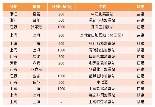 截至2019年4月,长三角区域在建/拟建加氢站有14座,这些加氢站分别位于嘉善、台州、张家港、嘉善、上海、盐城、仪征等地,其中6座位于上海,江苏5座,浙江2座,安徽1座,个别加氢站如氢能小镇加氢站和明天氢能加氢站建站时间已经超过一年。