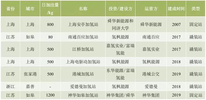 截至2019年4月,长三角区域已经运营和建成的加氢站有11座,已经拆除1座,这些加氢站分别位于上海、常熟、如皋、张家港、嘉善等地,其中6座位于上海,江苏4座,浙江1座,而且多为企业研发测试用场内站。