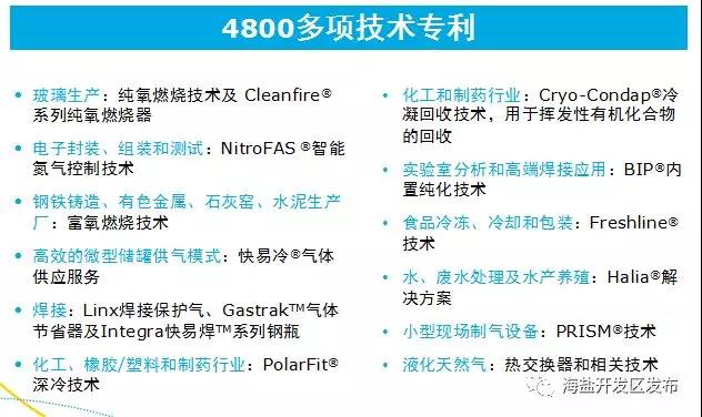 公司于1987年开始投资中国大陆,总部位于上海,已设立遍布全国各地的140多个生产设施和70多家公司,建成了十几套超大型空分装置,拥有2700名员工,在上海设立了研发中心和低温设备制造中心。