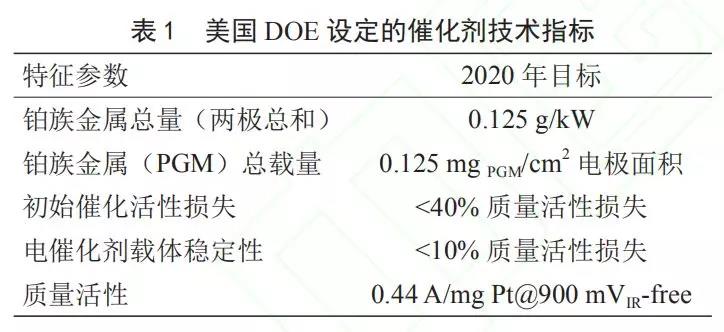 从燃料电池极化曲线可以看出,提高燃料电池性能首先要降低活化极化,而活化极化主要与催化剂活性密切相关。燃料电池在反应过程中,由于氧还原反应(ORR)的交换电流密度远低于氢氧化反应(HOR),一般极化损失主要来自于阴极侧(空气侧)。因此,研究焦点是提高阴极侧催化剂的活性。目前,质子交换膜燃料电池中常用的商用催化剂是铂炭催化剂(Pt/C),是由 Pt 的纳米颗粒分散到碳粉(如 XC-72)载体上的担载型催化剂,实际使用测试发现这种商用催化剂在活性、稳定性等方面都存在一定不足。美国能源部(DOE)催化剂指标如表1所示,研究者通过Pt晶面控制、Pt-M合金催化剂、Pt-M核壳催化剂、Pt表面修饰、Pt单原子层催化剂等多种途径探索高活性、高稳定性催化剂的解决方案,在这些研究中目前可以实际应用的只有Pt-M合金催化剂。