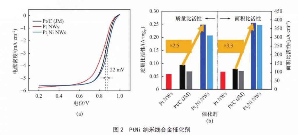 Pt-M催化剂是Pt与过渡金属形成的合金催化剂,通过过渡金属催化剂对Pt的电子与几何效应,在提高稳定性的同时,质量比活性也有所提高;同时,降低了贵金属的用量,使催化剂成本也得到大幅度降低。 如Pt-Co/C、Pt-Fe/C、Pt-Ni/C等二元合金催化剂,展示出了较好的活性与稳定性。Chen 等人利用铂镍合金纳米晶体的结构变化,制备了高活性与高稳定性 Pt3Ni 纳米笼催化剂,其质量比活性与面积比活性分别提高36倍与22倍。在Pt合金催化剂应用方面,丰田汽车公司披露了在所发布的商业化燃料电池车Mirai上就是采用了Pt-Co合金催化剂,使其催化剂活性提高了1.8倍。中国科学院大连化学物理研究所(大连化物所)开发的Pt3Pd/C催化剂已经在燃料电池电堆得到了验证,其性能可以完全替代商品化催化剂;此外,大连化物所还研制出了超小PtCu合金催化剂,其质量比活性是目前Pt/C的3.8倍;PtNi 纳米线合金催化剂质量与面积比活性分别达到Pt/C的2.5倍和 3.3 倍(见图2),展示了较好的应用前景。