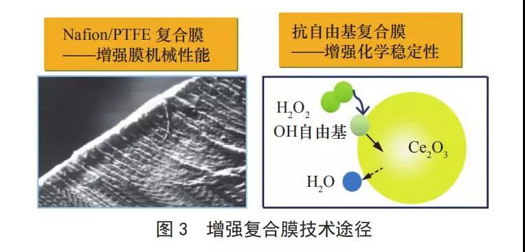 机械增强膜如以多孔薄膜(如多孔PTFE)或纤维为增强骨架、浸渍全氟磺酸树脂制成复合增强膜,分布于贯穿多孔膜之间的树脂保证了质子传导,多孔基膜使薄膜的强度提高,同时尺寸稳定性也有大幅改善,如美国戈尔公司的复合膜、中国大连化物所的专利技术 Nafion/PTFE 复合增强膜和碳纳米管增强复合膜等。化学增强是为了防止由于电化学反应过程中自由基引起的化学衰减,加入自由基淬灭剂可以在线分解与消除反应过程中的自由基,提高耐久性。大连化物所采用在Nafion膜中加入1wt.%的CsxH3?xPW12O40/CeO2 纳米分散颗粒制备出了复合膜,利用CeO2中的变价金属可逆氧化还原性质淬灭自由基,CsxH3?xPW12O40 的加入在保证了良好的质子传导性同时还强化了H2O2催化分解能力。南京大学在质子交换膜中加入抗氧化物质维生素E,其主要成分α-生育酚不仅能够捕捉自由基变为氧化态,而且能够在渗透的氢气帮助下,重新还原,从而提高了燃料电池寿命。
