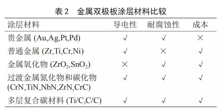 金属是电与热的良导体,其作为双极板材料得到越来越普遍的应用,尤其是车辆空间限制(如乘用车),要求燃料电池具有较高的功率密度。薄金属双极板以其可以实现双极板的薄型化及本征的优良导电特性,成为了提高燃料电池功率密度的首选方案;目前各大汽车公司大都采用金属双极板技术,如丰田汽车公司、本田株式会社、现代汽车有限公司等。金属双极板技术挑战是其在燃料电池环境下(酸性、电位、湿热)具有耐腐蚀性且对燃料电池其他部件与材料的相容无污染性。目前常用的金属双极板材料是带有表面涂层的不锈钢或钛材。针对燃料电池不锈钢双极板表面耐腐蚀涂层技术,国内外进行了大量的学术研究工作,其涂层材料要保证耐腐蚀、导电兼备性能,代表性的涂层材料如表2所示。总体来说,表面涂层材料可以分为金属、金属化合物与碳涂层三类;金属类包括贵金属以及金属化合物。贵金属涂层,如金、银、铂等,尽管成本高,但由于其优越的耐蚀性以及与石墨相似的接触电阻使其在特殊领域仍有采用。为了降低成本,处理层的厚度尽量减薄,但是要避免针孔。金属化合物涂层是目前研究较多的表面处理方案,如Ti-N,Cr-N,Cr-C 等表现出较高的应用价值。除了金属类涂层以外,在金属双极板碳类膜方面也有一定探索,如石墨、导电聚合物(聚苯胺、聚吡咯)以及类金刚石等薄膜,丰田汽车公司Ce2O3H2O 的专利技术(US2014356764)披露了具有高导电性的 SP2 杂化轨道无定型碳的双极板表面处理技术。