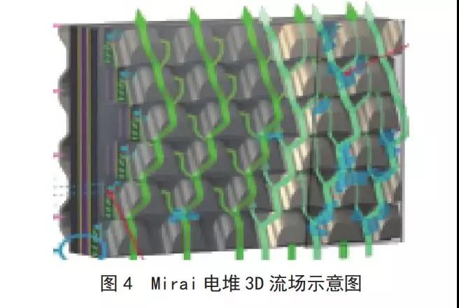 合理的双极板流场设计与布局,可以起到降低传质极化作用,有利于提高大电流密度下的性能,进一步提高电堆的功率密度。丰田汽车公司在Mirai 燃料电池车电堆中推出了3D流场新型设计理念(见图 4),改变了传统蛇型、平行沟槽型的2D流场构型,使流体有垂直于乙醇胺(MEA)气体扩散层与催化层的分量,反应物与生成物不是单纯依靠浓差扩散到达与脱离反应界面,而是有强制对流作用,极大地改善了燃料电池传质推动力,性能得到显著提升。此外,这种3D流场具有一定的储水功能,有利于燃料电池运行时的湿度调整,可以提高低增湿下燃料电池性能。