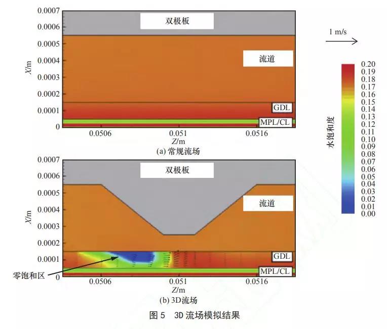 通过模拟计算可以更进一步证实3D流场强化了流道、扩散层的排水能力(见图 5,3D 流场在扩散层内出现了水的零饱和区),同时增加了氧气在催化层的强制对流,尤其在高电流时与2D常规平行沟槽流场比较,燃料电池性能有了很大的提升。