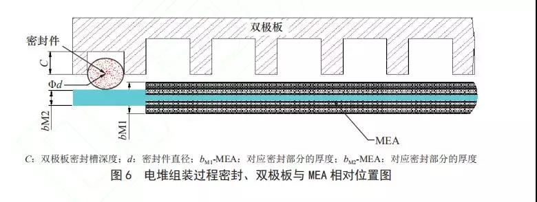 电堆组装过程通常是在压力机上进行的,一般是依据一定的组装顺序及定位方法,把MEA与双极板摞装起来并附以集流板、端板,通过紧固装置固定形成一个完整的电堆。电堆组装除了要保证电堆密封性外,还要保证 MEA 与双极板界面的良好接触。电堆设计阶段要考虑电堆密封元件形变与MEA 形变的匹配,在组装过程中通过控制电堆高度定量双极板向膜电极扩散层中嵌入深度,并同时使密封元件达到预定的变形量。图6为电堆组装过程密封件、双极板与 MEA 相对位置图,电堆组装高度为h=h1=h2,其中h1为满足MEA压深以获得预期较小接触电阻的组装高度;h2为满足密封变形要求的组装高度,一般通过离线试验可以确定获得较小接触电阻 MEA 的压深率 fM 和密封件压缩率fr,密封件压缩率fr根据密封结构与材料可在一定范围内调整(如30%~60%)。