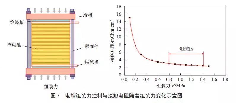除了用高度控制来获得电堆最佳组装匹配外,还可以采用组装力控制法确定电堆部件之间的良好匹配关系。组装力可以通过组装机械如油压机实施,随着组装力加大,双极板与 MEA 间的接触逐渐减少,当达到平缓区即为最佳的组装力控制区(见图7),通常接触电阻与组装力的关系可以在电堆组装前通过单电池试验离线获得,并确定接触电阻达到较小状态对应的组装力。