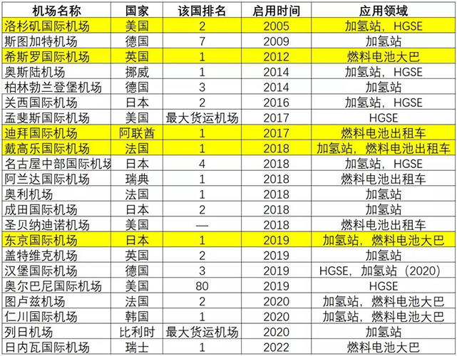 (作者统计,标黄为全球TOP10机场,HGSE指氢能地面支持设备)