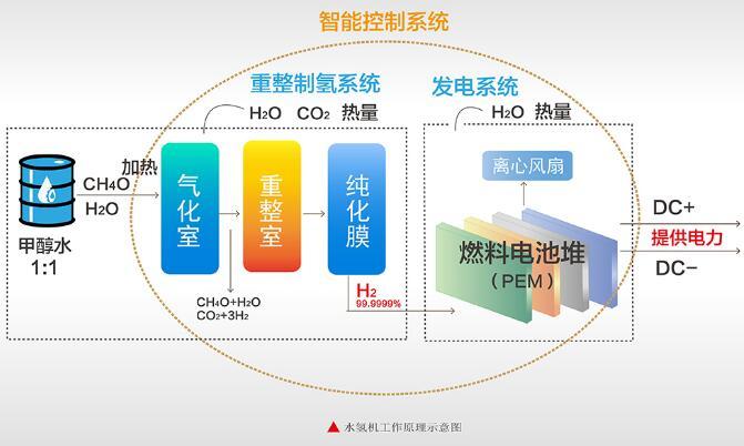 随着用氢思路逐步转变,集团公司在国内已经率先开发和生产出甲醇重整制氢与燃料电池发电高度集成的小型化系统发电装置“水氢机”,采用催化重整及纯化多项技术从甲醇水中获得高纯氢,再通过质子膜系统产生电、热等多种能源。水氢机实现了氢能的即产即用,让难以储运的氢能随时随地动起来,解决了氢能应用的安全问题、成本问题及加氢基础设施建设的巨额投资问题,为氢能的广泛应用打开了大门。