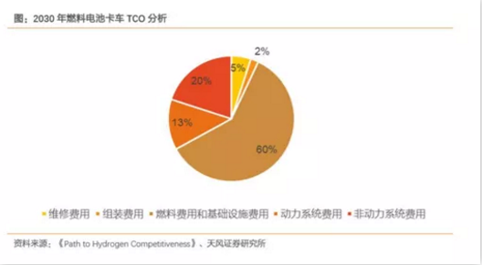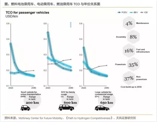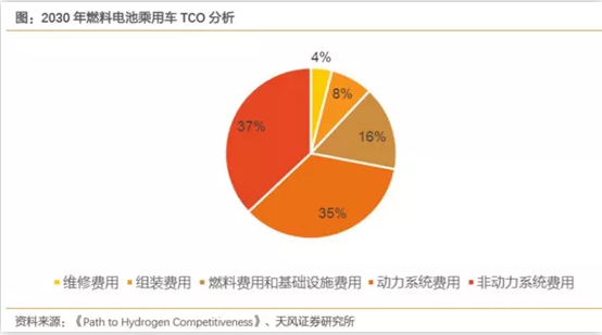 就乘用车而言,预计2030年动力系统成本的占比为35%,其中包括燃料电池系统、氢罐和电池等部件。而如今燃料电池系统成本大约占总拥有成本的50%。