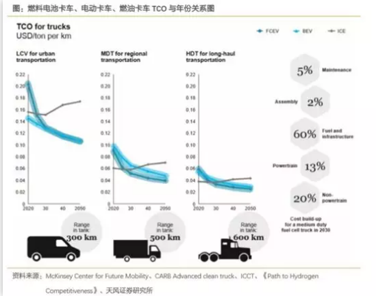 就燃料电池卡车而言,燃料和基础设施成本是燃料电池卡车成本的重要组成部分,约占总拥有成本的60%。因此,通过推动氢气成本的下降达到燃料电池卡车的下降。