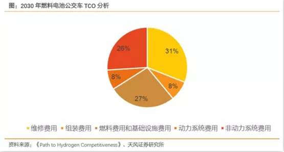 可以看出,燃料和基础设施成本、维修成本是燃料电池公交车成本的重要组成部分,各占总拥有成本的27%和31%。