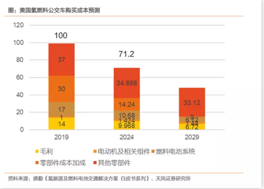 氢气价格会随着燃料电池市场的扩大而下降,根据预测,当每年燃料电池公交车年产量达到两万时,氢气成本会降低50%,达到4-5美元/公斤的价格。生产规模的扩大同样带来燃料电池组件成本的下降,同样技术进步也会带来核心部件使用寿命的延长。