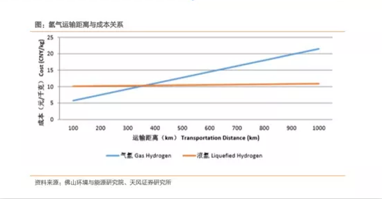此外,针对占比较大的运输成本,发展液氢运输技术目前大势所趋,国家科技部2019年国家重点研发计划“可再生能源与氢能技术”等9个重点专项项目申报指南建议,把”车载液体储氢“列入关键共性技术,在200km运输距离时,液氢的运输成本只有高压氢的八分之一,且液氢远距离运输能力远远超过高压氢。一旦液氢运输技术发展成熟,氢气价格将有显著降低。