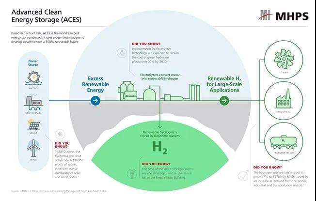 MHPS还通过犹他州高级清洁能源存储(ACES)项目,开发了网格化大规模的可再生氢生产和存储技术。ACES项目使用可再生能源通过电解生产氢气。氢气将在现场的地下盐穴实现跨季节存储,并供给墨西哥湾沿岸的炼油厂。当风、光可再生能源发电受限时,存储的可再生氢可以直接发电。