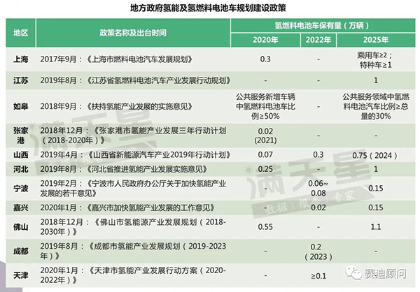 同时,部分地方政府已发布了地方氢能产业发展规划。目前已有10余省或市相继出台规划政策,通过规划未来发展氢燃料电池车数量等形式推动氢能发展,从而助推车载储供氢系统快速发展。