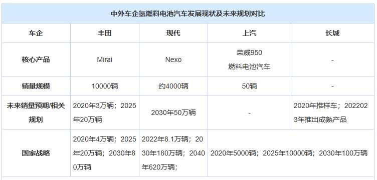 在商业化进程上,长城汽车与上汽集团还有一段距离。按照长城汽车此前公布的规划显示,其氢燃料电池汽车至少要在2023年才能够实现量产上市。