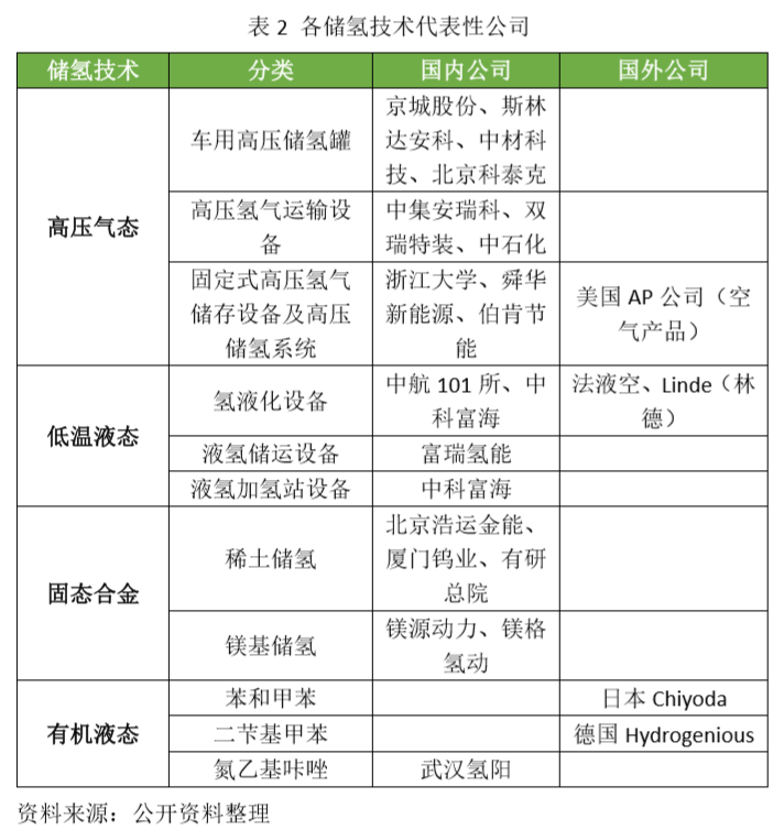 此部分主要罗列了以上四种储氢技术的代表性公司。在梳理相关公司时,将四种技术按照各自不同的特点从不同角度进行了分类。