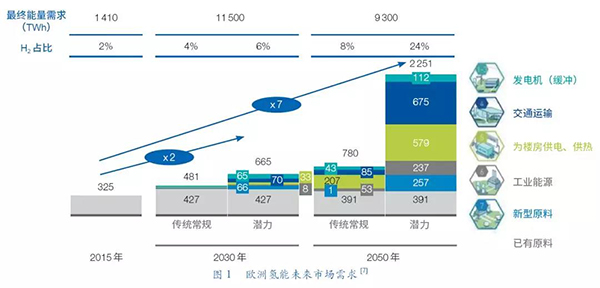 为了实现欧洲二氧化碳减排目标,必须发展氢能。对于诸如天然气网、运输(特别是重型车辆)关键部分的规模脱碳、高级燃料和化学原料需要大量使用氢气。此外,氢气可以解决大规模整合可再生能源以及实现低成本季节性储能和跨区域有效清洁能源运输中的技术难题。报告认为,到 2050 年,氢能将在各个领域发挥重要作用,并为了实现欧洲 2050 年氢能产业目标,设置了短期和中期目标。