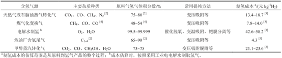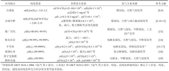 表2 不同应用场合对氢气纯度和杂质含量的基本要求及主要氢气来源